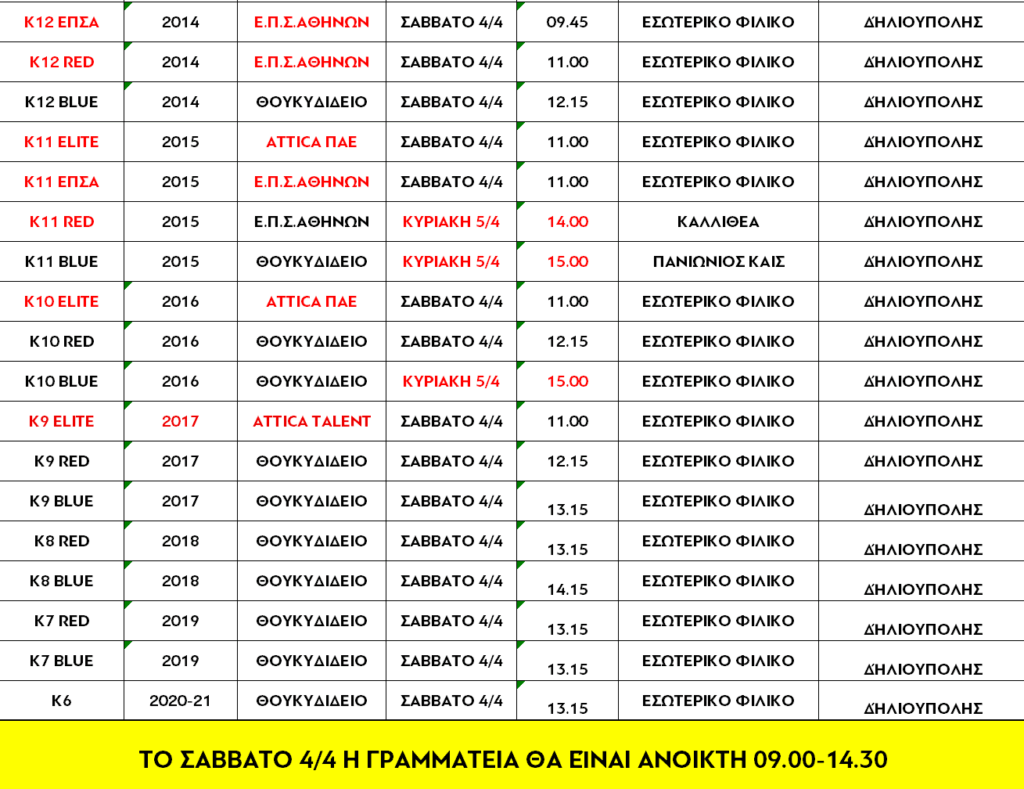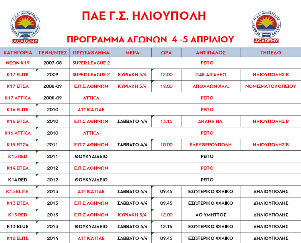 Παρακάτω, μπορείτε να δείτε το πλήρες πρόγραμμα των αγωνιστικών υποχρεώσεων των τμημάτων της ακαδημίας μας, για το Σαββατοκύριακο 4 & 5 Απριλίου 2026.